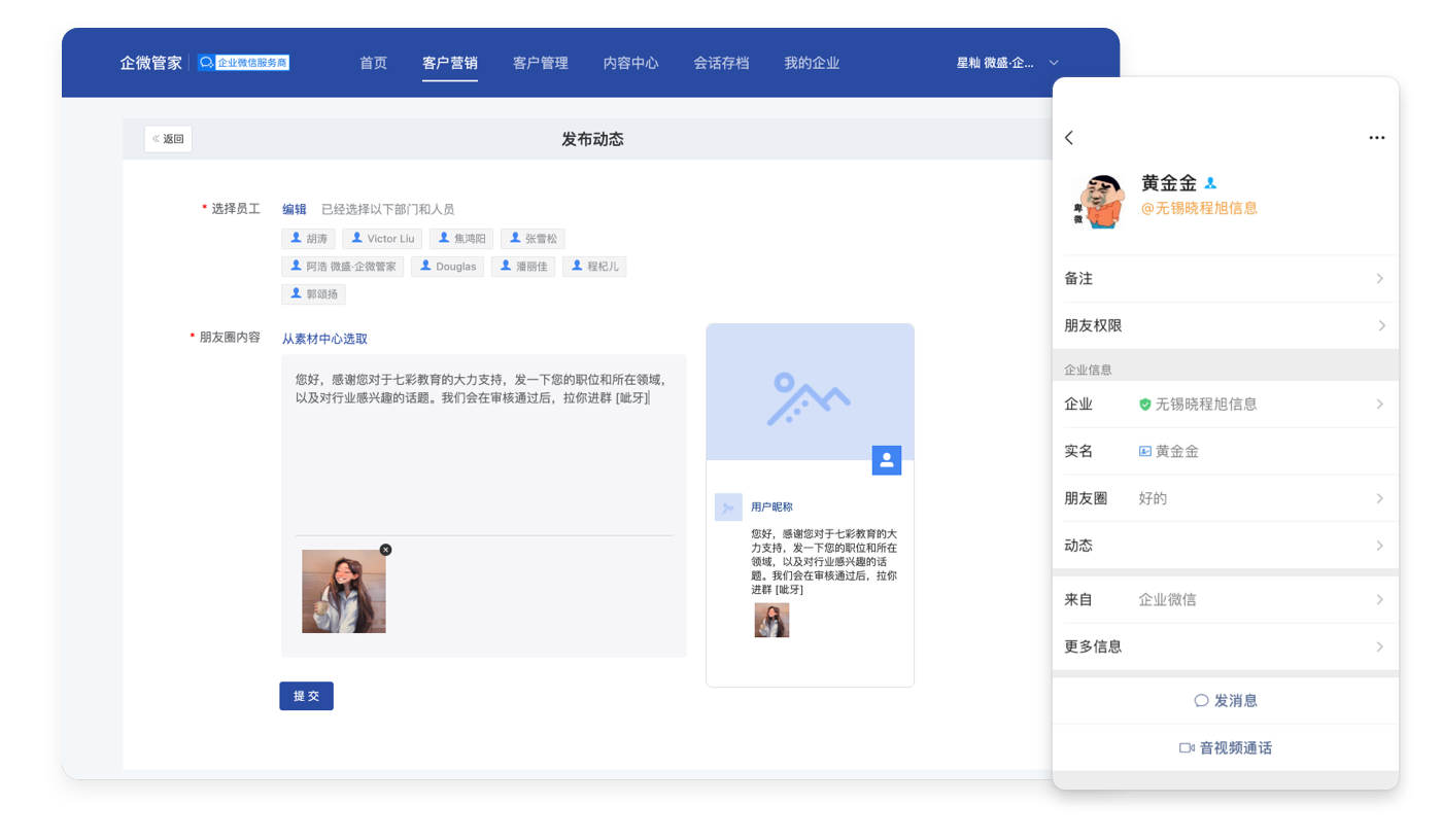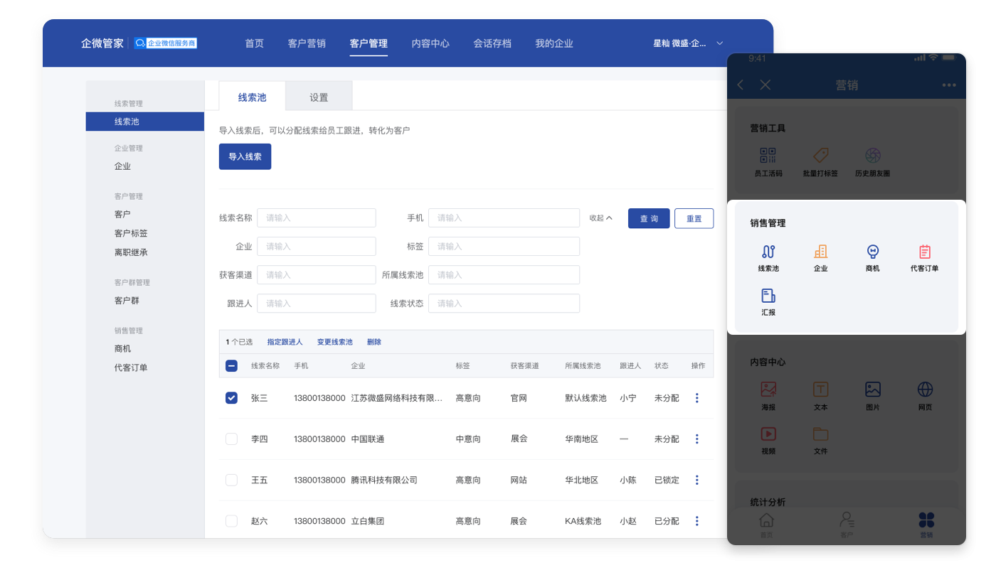 提供海报和素材、营销插件、客户分析等,支持To B的销售过程管理